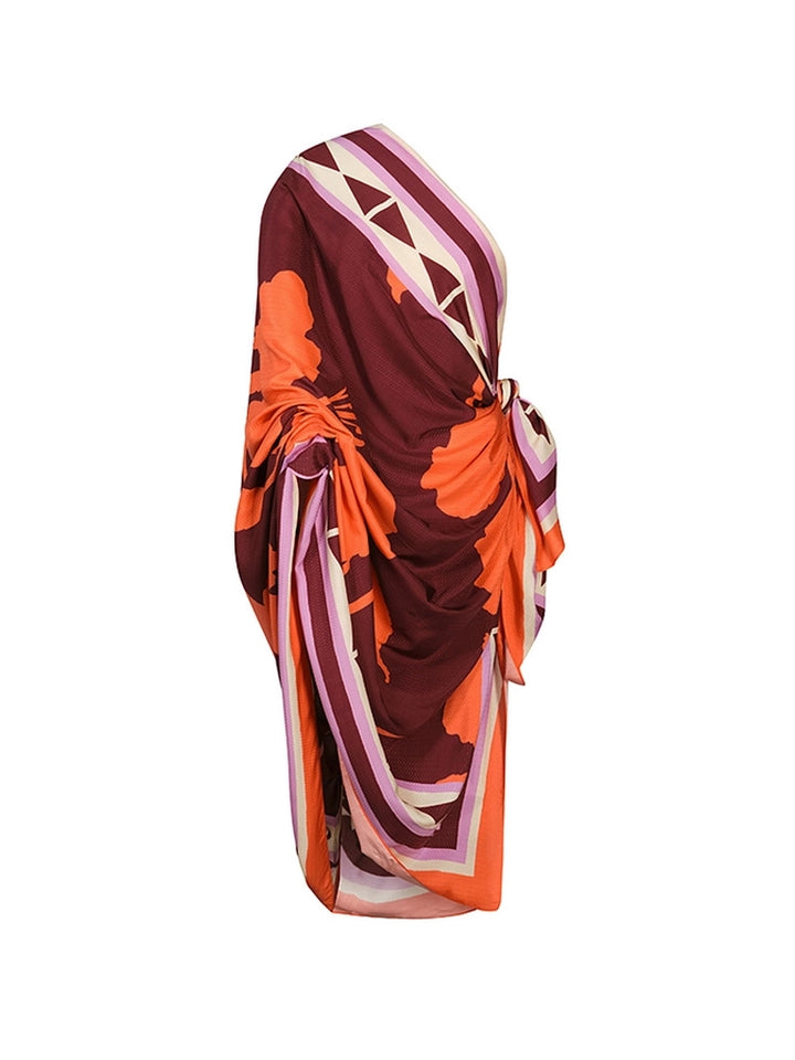 Bold orange and black ethnic print delivers vibrant visual impact one-shoulder cut adds contemporary elegance high-stretch fabric offers comfort and shaping sculpted design enhances natural curves.