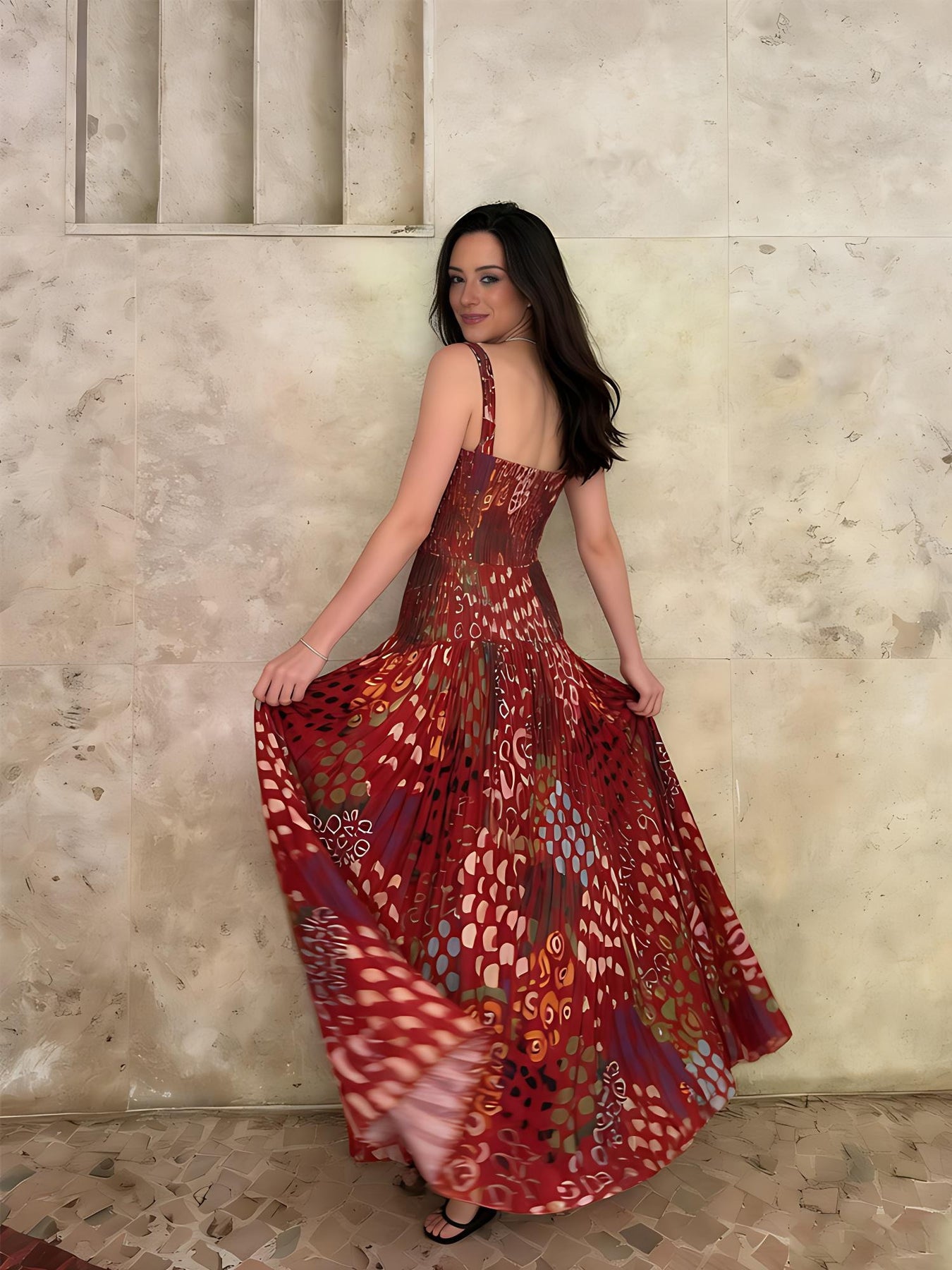 A striking sleeveless maxi dress featuring a rich red base adorned with abstract vintage-inspired artwork. The bold print brings depth and character, creating a look that feels both artistic and timeless. Its long, flowing silhouette adds elegance and ease, making it a standout choice for those who appreciate expressive, statement-making style.