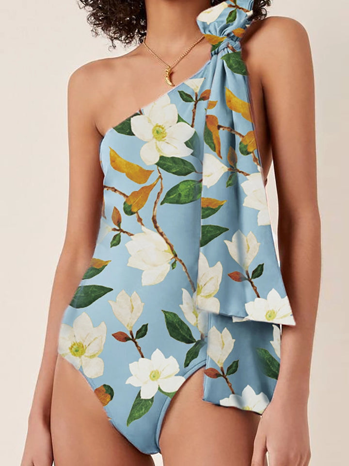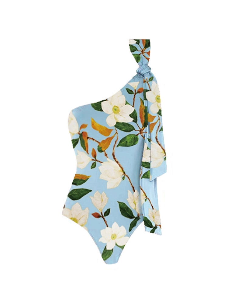 This one-shoulder fresh floral one-piece swimsuit set embodies youthful charm with its delicate floral print and asymmetrical neckline. The vibrant yet soft floral patterns exude a light, airy vibe, perfect for creating a fresh and feminine beach look. The one-shoulder design adds a touch of elegance and modernity, while the high-stretch fabric offers a flattering and comfortable fit. Whether you're lounging by the pool or soaking up the sun, this swimsuit set combines style and comfort effortlessly.