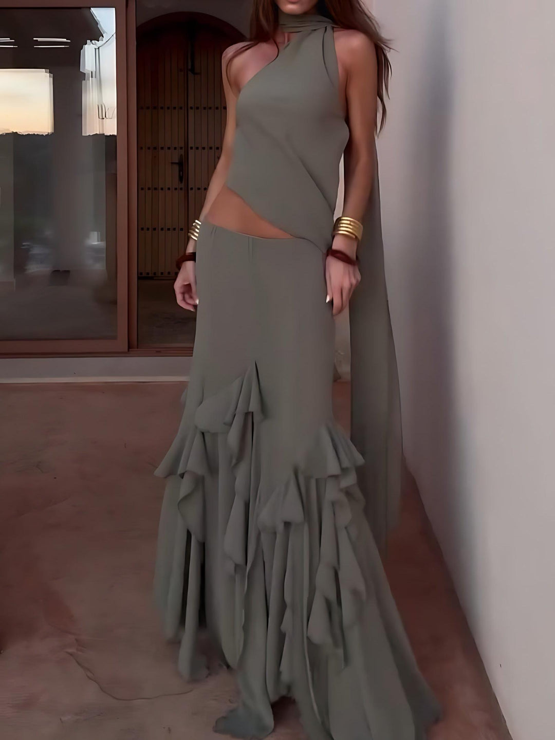Vintage Sage Green Tie-Dye Pocket Slim Suede Maxi Dress