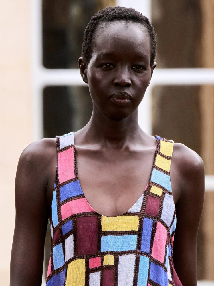 The technique, named “Let it Rip,” channels the expressive energy of Gabriela’s geometric motifs and Aurora’s brushstroke palette into a soft, sleeveless silhouette. The result is a floating vest-style dress that moves like paint on canvas — imperfect, intentional, and endlessly expressive.