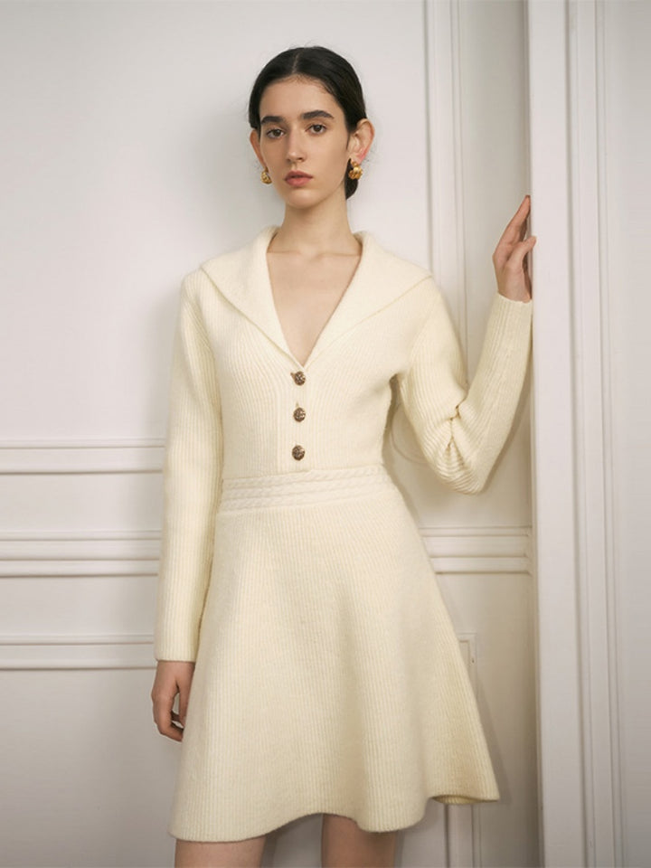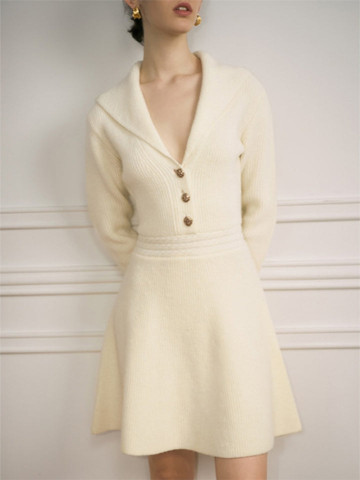 Embrace effortless French elegance with our button-down knit mini dress, featuring a delicate notched collar and flattering V-neckline. Crafted from premium soft wool blend fabric, this dress offers both warmth and style with its graceful A-line silhouette and defined high-waist design. The full-length sleeves and polished front button details create a sophisticated timeless appeal, while the stretchy knit material ensures comfortable movement. Perfect for transitioning through seasons, this versatile dress can be dressed up or down for various occasions while maintaining its chic Parisian charm.
