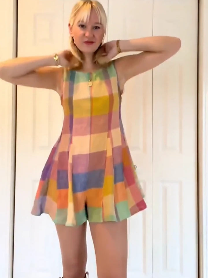 Step into sunny, playful style with the Vibrant Patchwork Sleeveless Grid Jumpsuit. Featuring a cheerful patchwork of rainbow-hued squares, this sleeveless jumpsuit keeps you cool while adding instant color to your look. The flared hem creates a twirl-worthy silhouette, and a daring open-back detail adds a touch of bold sophistication. Perfect for casual outings or summer adventures, it pairs effortlessly with boots or sandals for carefree, vibrant vibes.
