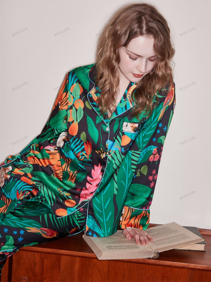 Tiger and Monkey Print Ice Silk Long-Sleeve Loungewear Set