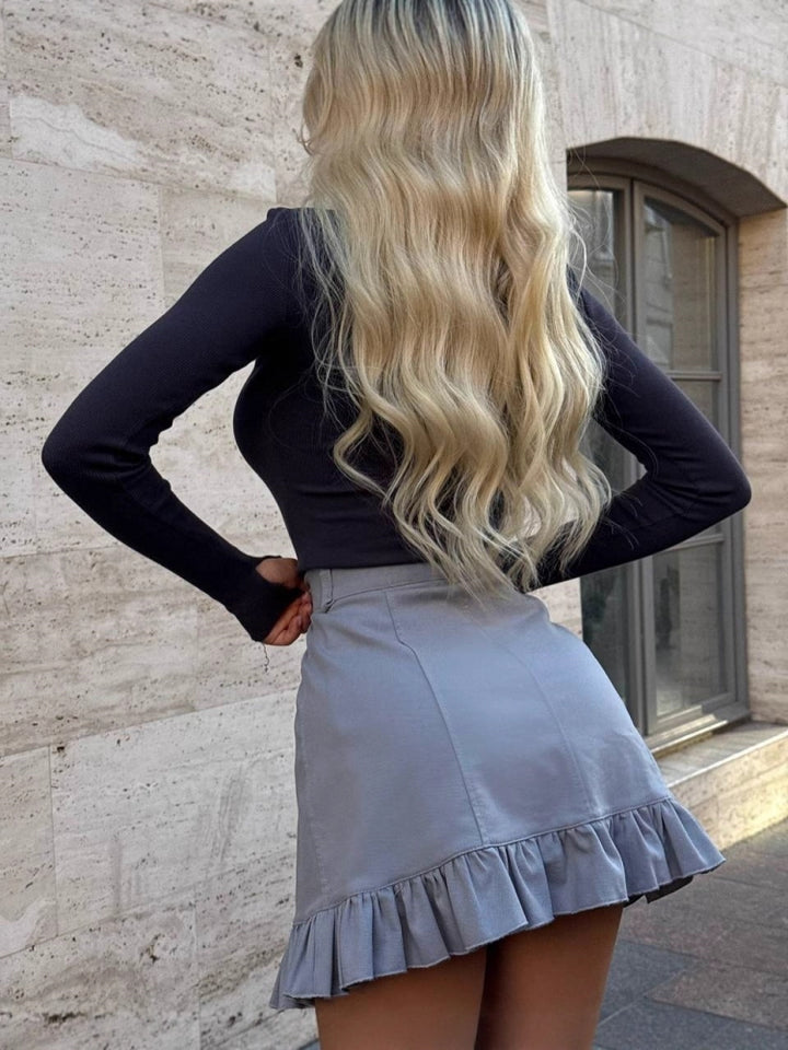 This charming mini skirt combines a playful ruffle hem with classic button-front detailing, creating the perfect blend of romance and modern style. The A-line silhouette flatters your figure, while the lightweight fabric ensures comfort and movement. Perfect for dates, brunch, or creating Instagram-worthy outfits.