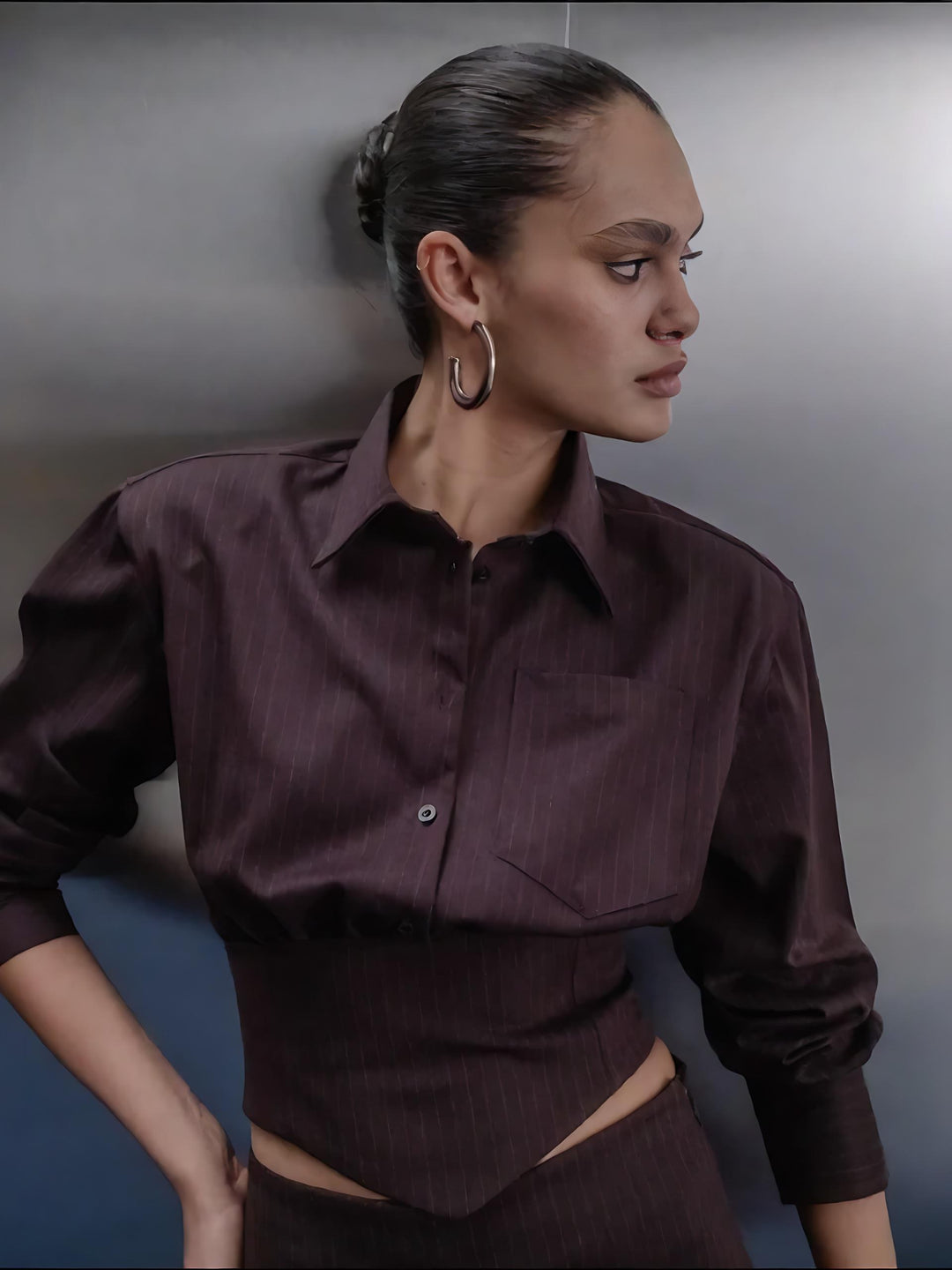 Burgundy Striped Backless Blouse & High-Waist Shorts Set
