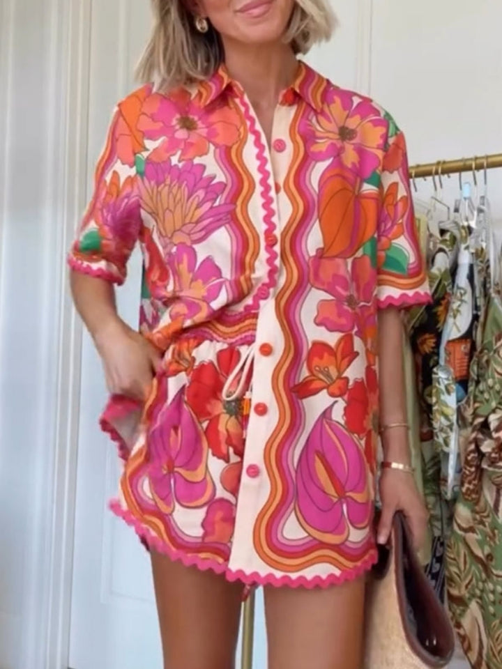 This stylish printed short-sleeve top set features a charming floral pattern and a comfortable five-sleeve design, perfect for warm weather. Made from lightweight, breathable fabric, it offers ease of movement and a relaxed fit. The set includes a matching top and bottom, creating a coordinated look that’s both trendy and versatile. Ideal for casual outings, beach trips, or everyday wear, this set combines fashion and functionality effortlessly.