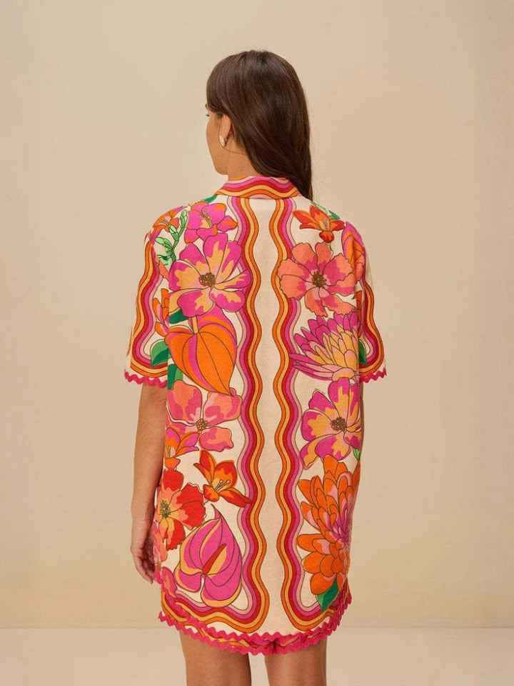 Sophisticated Satin Unique Cashew Flower Print Button Oversized Two-Pieces Set