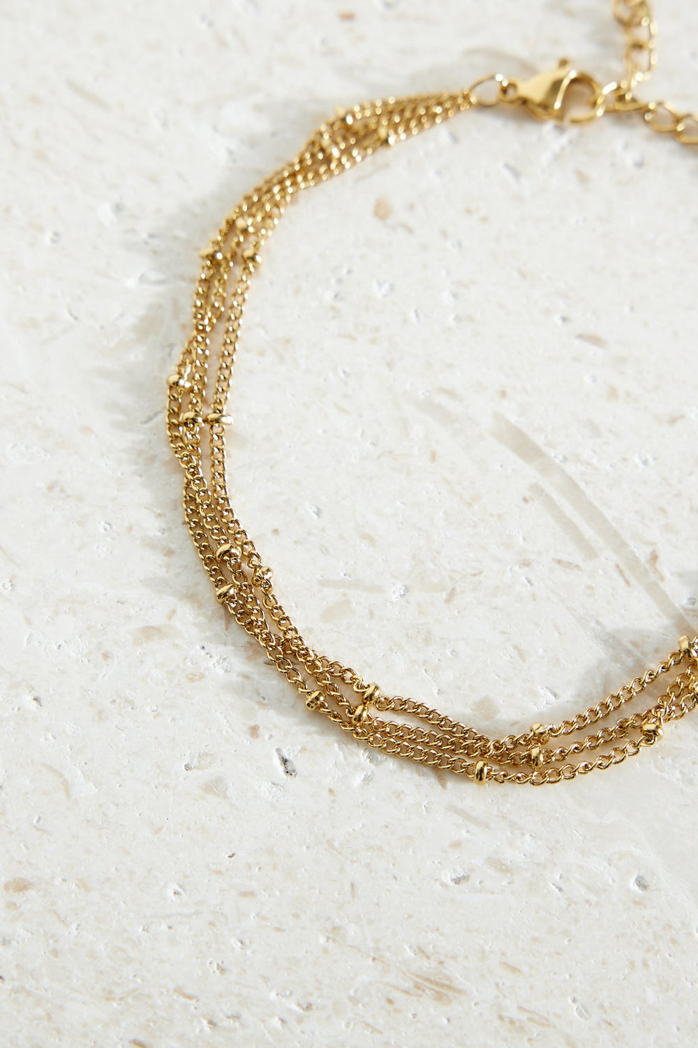 Esta es tu nueva pulsera diaria. La pulsera Dream Piece chapada en oro de 18k presenta un diseño de triple cadena y cierre de pinza de langosta.