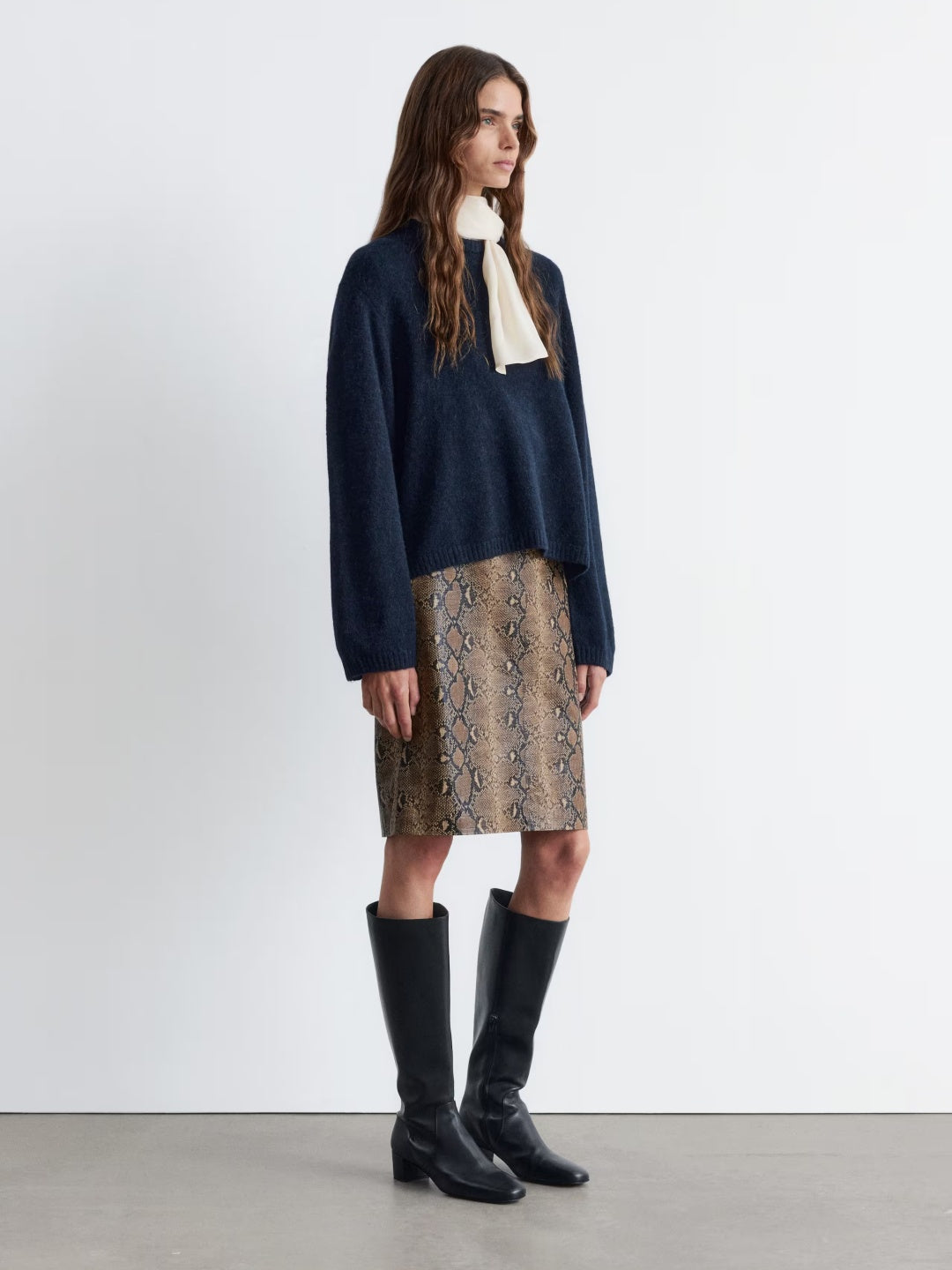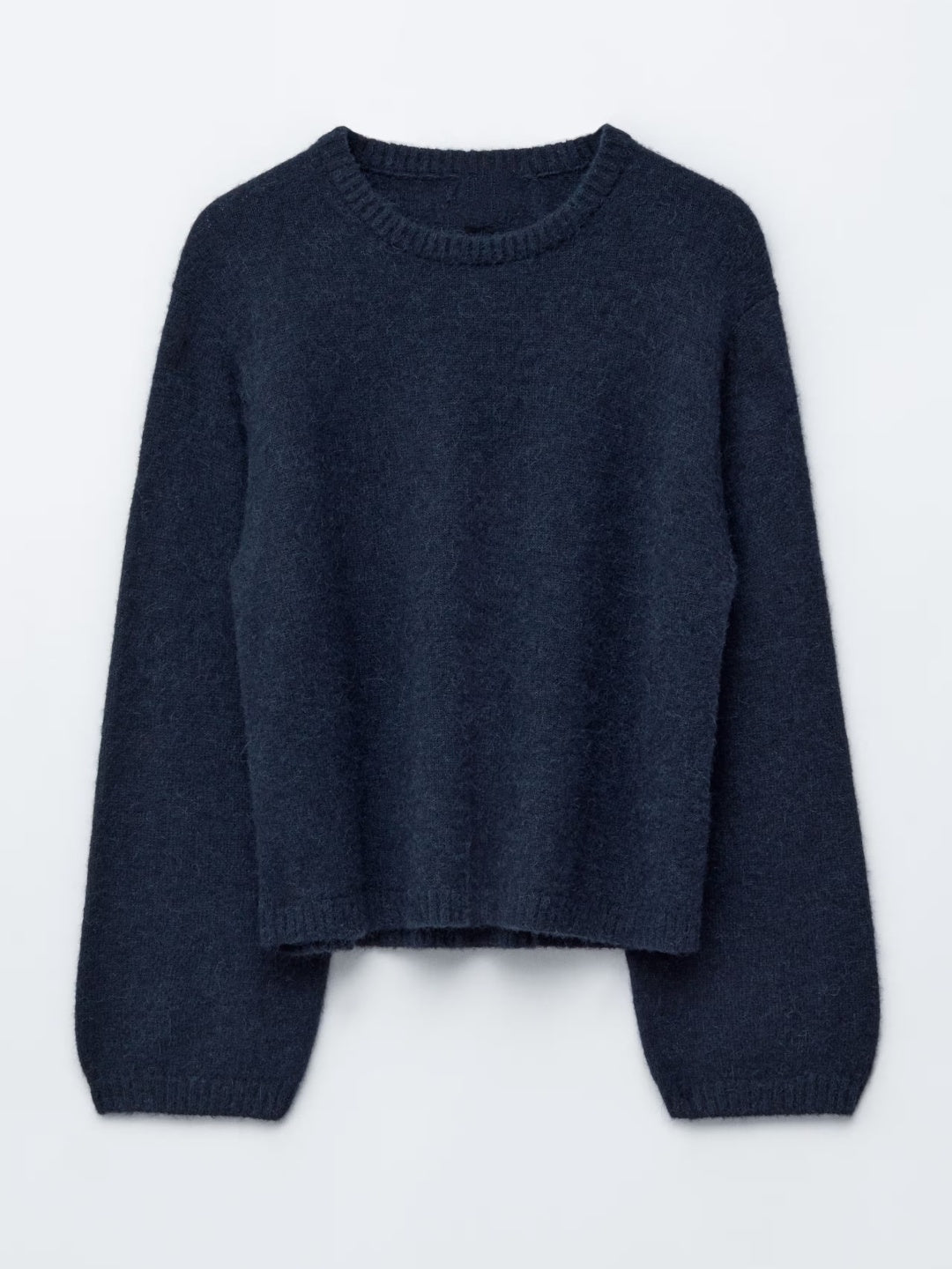 The set starts with a buttery-soft navy knit sweater: its relaxed, slightly oversized fit hugs gently, with a crew neck that feels effortlessly chic and long sleeves that keep you warm without weighing you down. It’s the kind of piece that feels like a favorite from the first wear, with a texture that’s rich yet subtle.