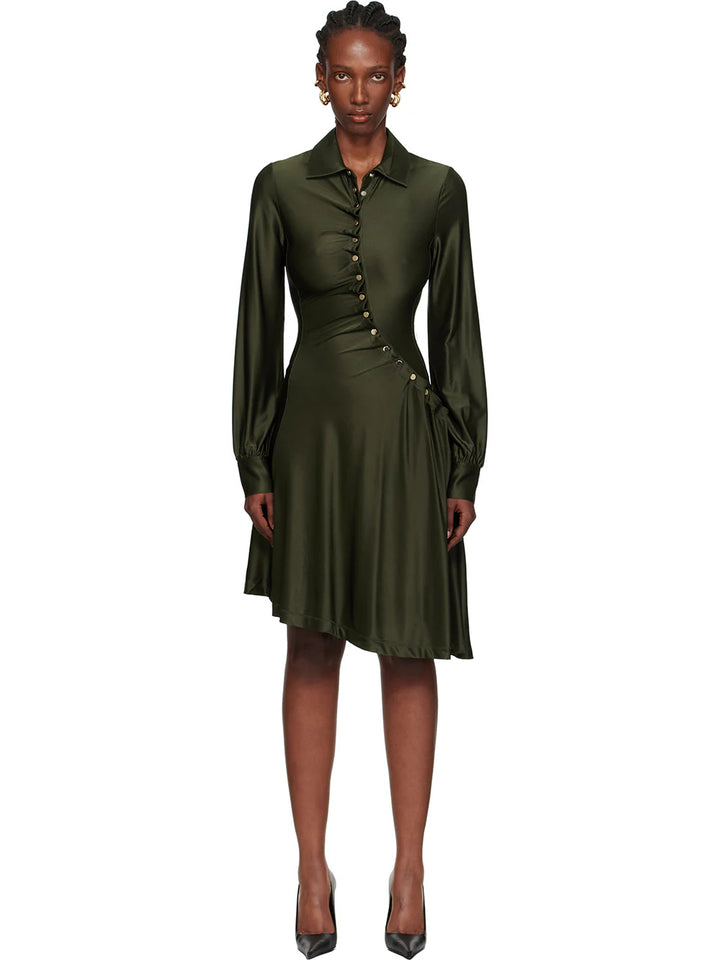 This olive green midi dress features a sophisticated shirt-style design with a collared neckline and button-down front. Made from smooth satin fabric, it offers long, elegant sleeves and a figure-flattering silhouette, while the asymmetric hem adds a modern, stylish twist.