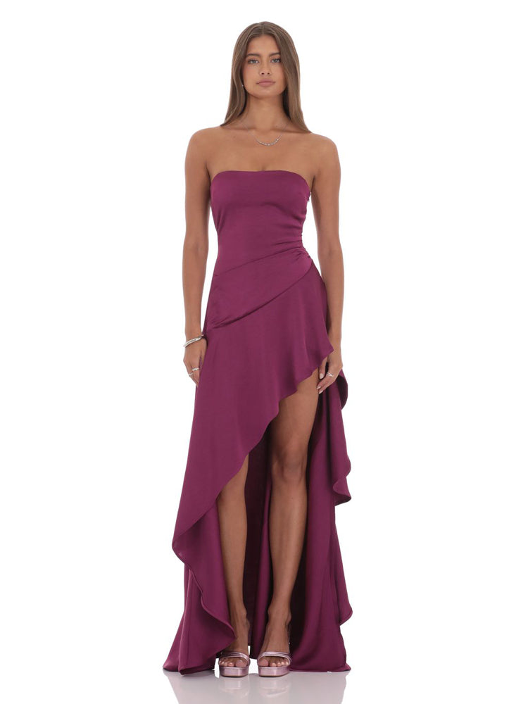 Strapless High-Shine Satin Asymmetric Slit Gown
