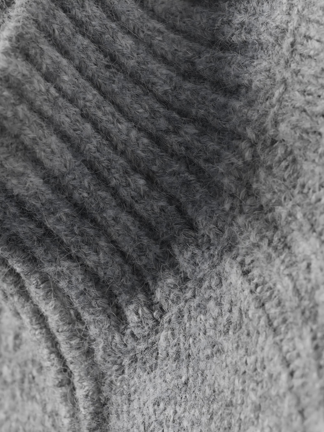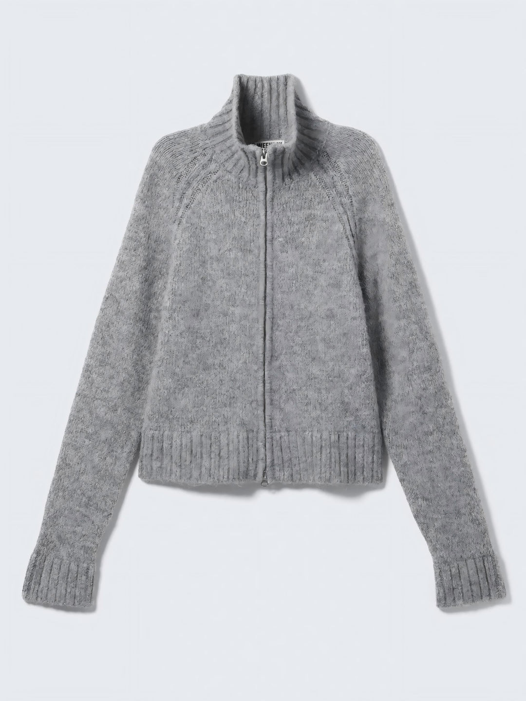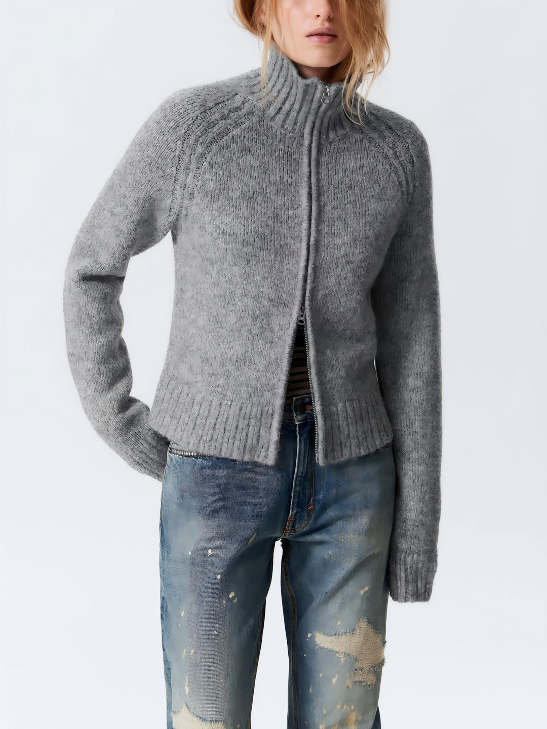 Knitted from a soft, textured yarn in a versatile grey melange hue, this slim-fit cardigan features a sculpted silhouette with raglan sleeves and a high ribbed collar for understated structure. The two-way zip closure allows styling flexibility, while wide ribbed cuffs and fully fashioned detailing highlight its precision craftsmanship.