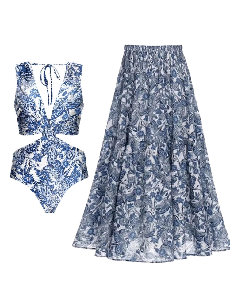 Dragonfly V Neck Cutout Skirted Swimsuit Set