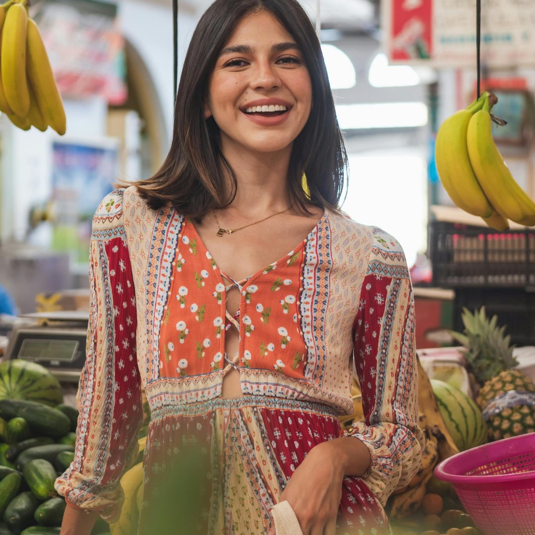 मैचिंग जिराफ प्रिंट के साथ फुल-लेंथ पैंट, जो टॉप को कॉम्प्लीमेंट करता है