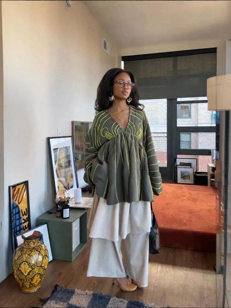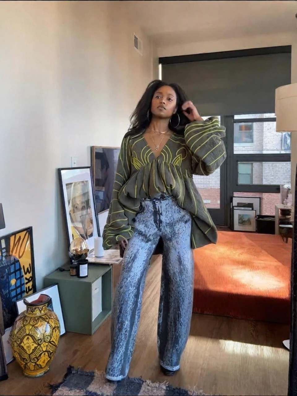 अनोखा प्रिंट इलास्टिक कमर पॉकेट वाला वाइड लेग पैंट-सेट
