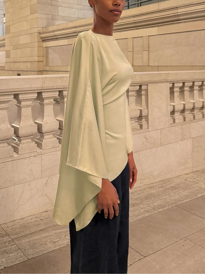 This satin butterfly top has ties to customize the fit, allowing you to create a defined silhouette or wear it loosely. It is designed to fit sizes 0 to 18. The Tall size offers extra length.