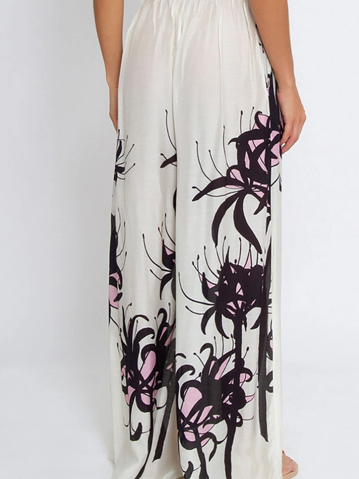 Bloemen unieke print elastische taille broek met wijde pijpen en zakken