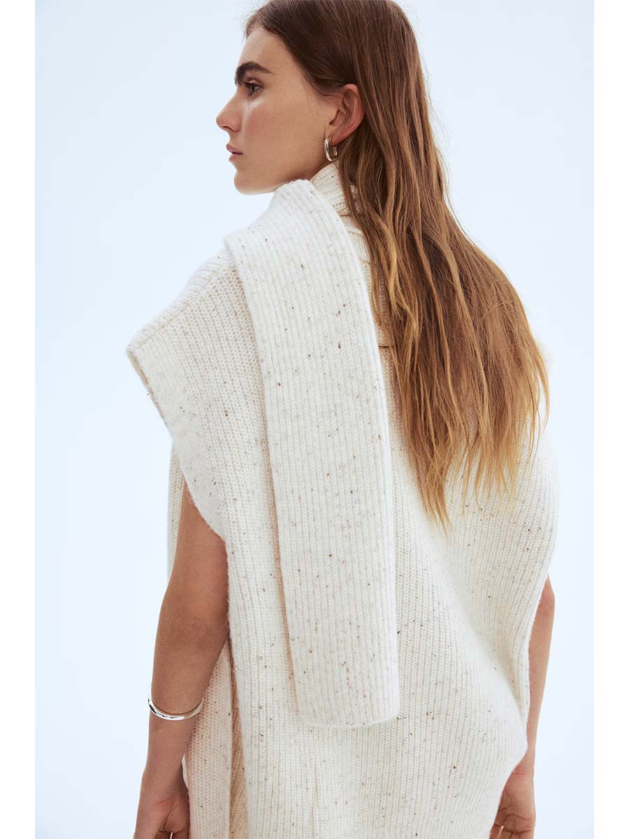 Embrace understated elegance with this three-piece knit set designed for comfort and refined style. It includes a sleeveless V-neck vest, a matching midi-length skirt, and a coordinating long scarf. Crafted from soft cream knit fabric with subtle speckled texture, the set offers a minimalist yet sophisticated aesthetic. The relaxed vest pairs beautifully with the streamlined skirt, while the scarf adds warmth and versatility for effortless layering.