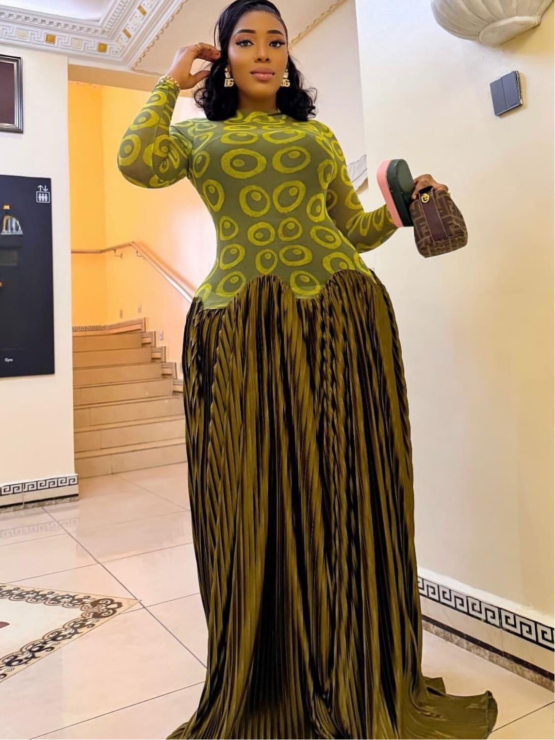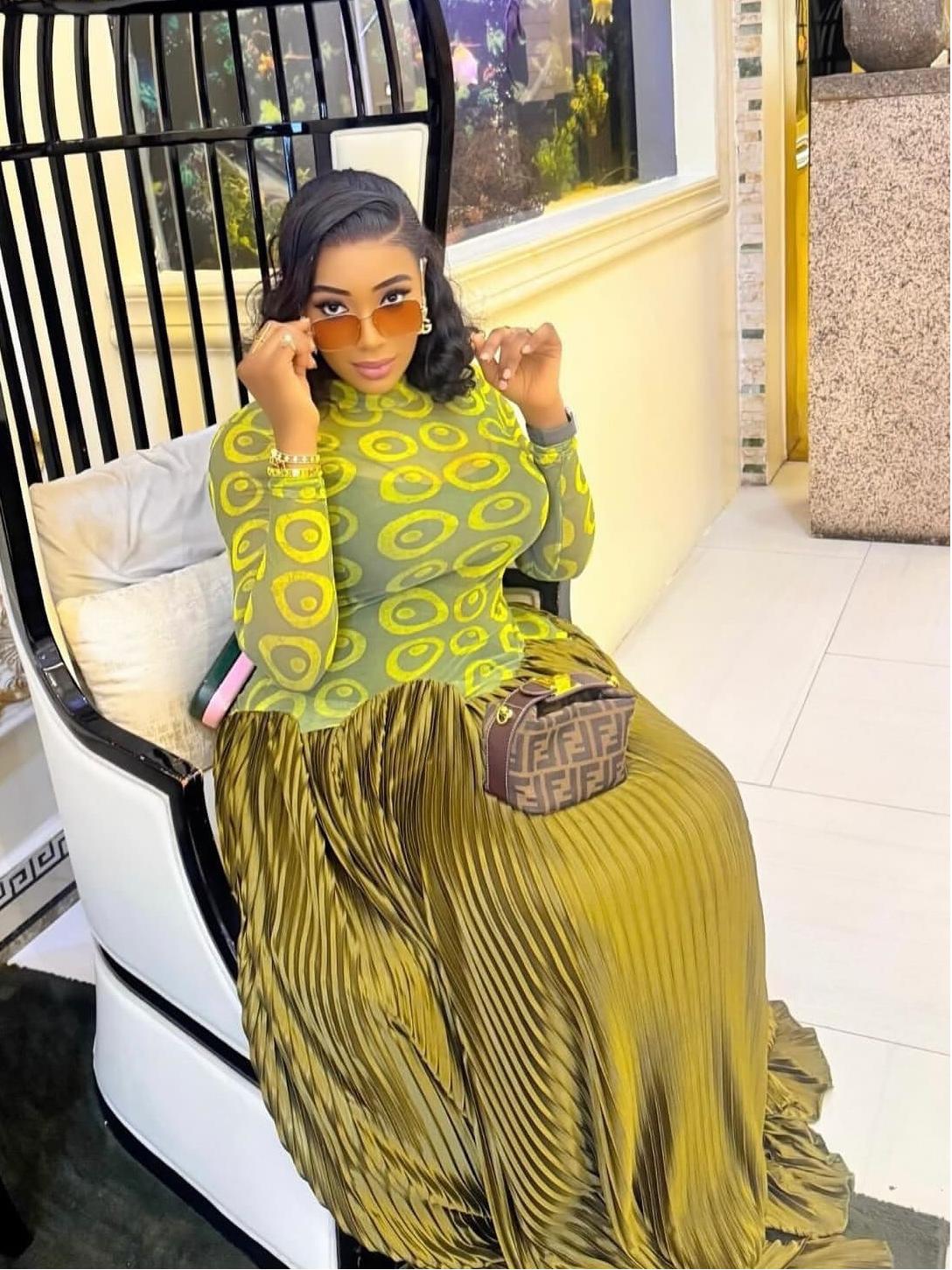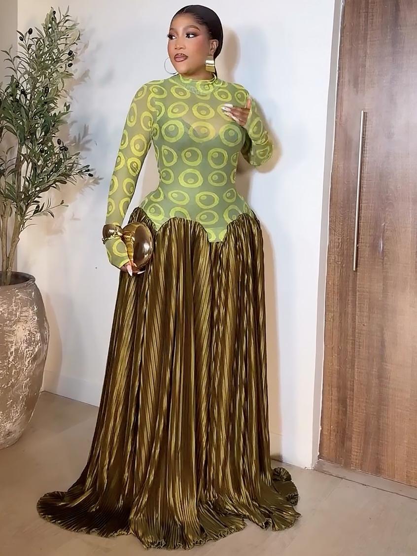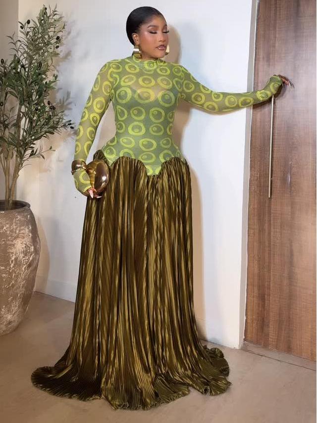 This olive-gold pleated maxi skirt is a masterpiece of texture and drama. Crafted from lustrous, accordion-pleated satin that catches light with every movement, it drapes into a sweeping train for red-carpet grandeur. The high-waisted silhouette is cinched just below a scalloped, petal-cut edge where a sheer lime-green mesh bodysuit peeks through, blending bold transparency with sculptural volume. Perfect for galas, premieres, or any moment demanding unapologetic presence—spring through winter.