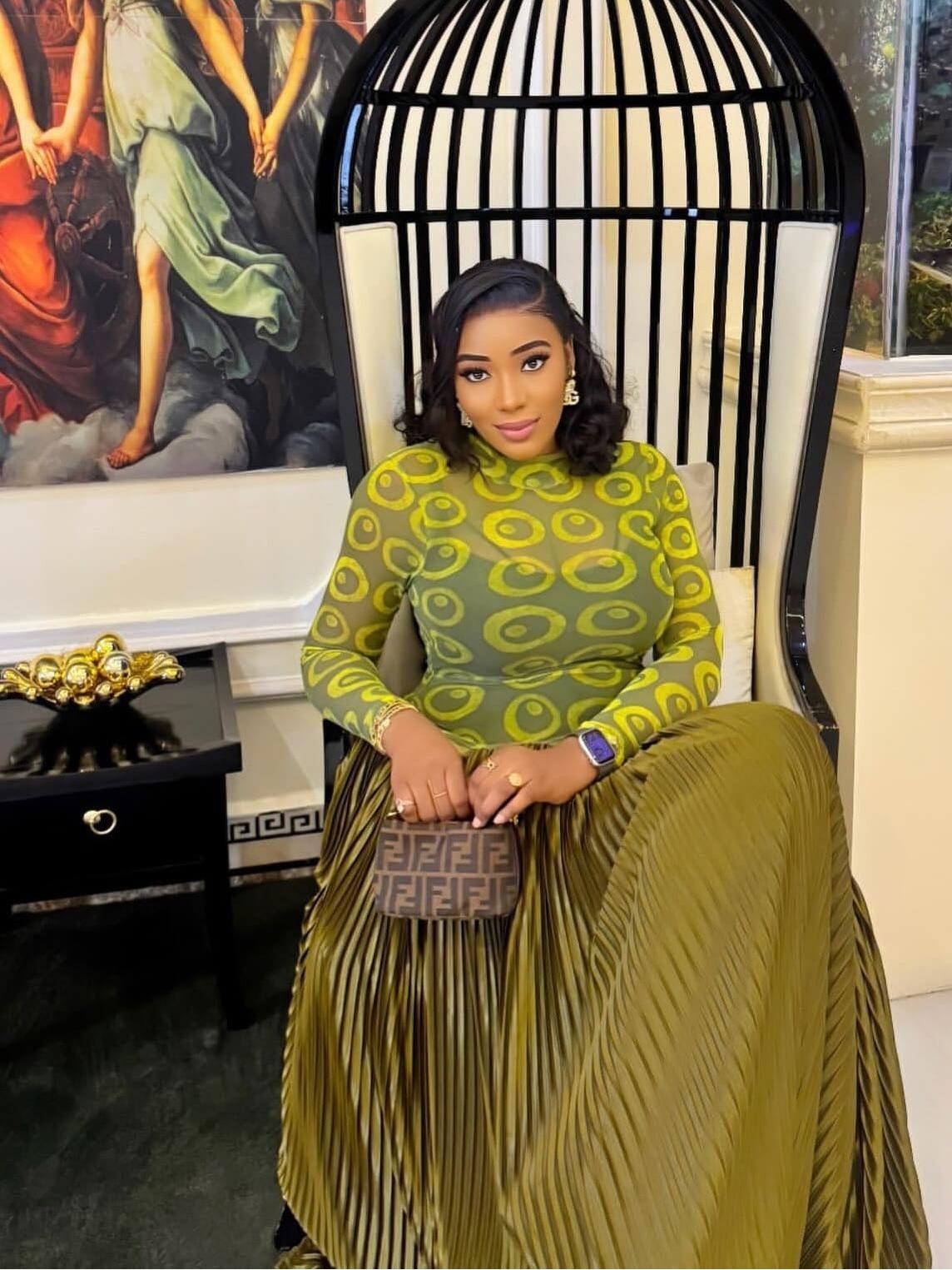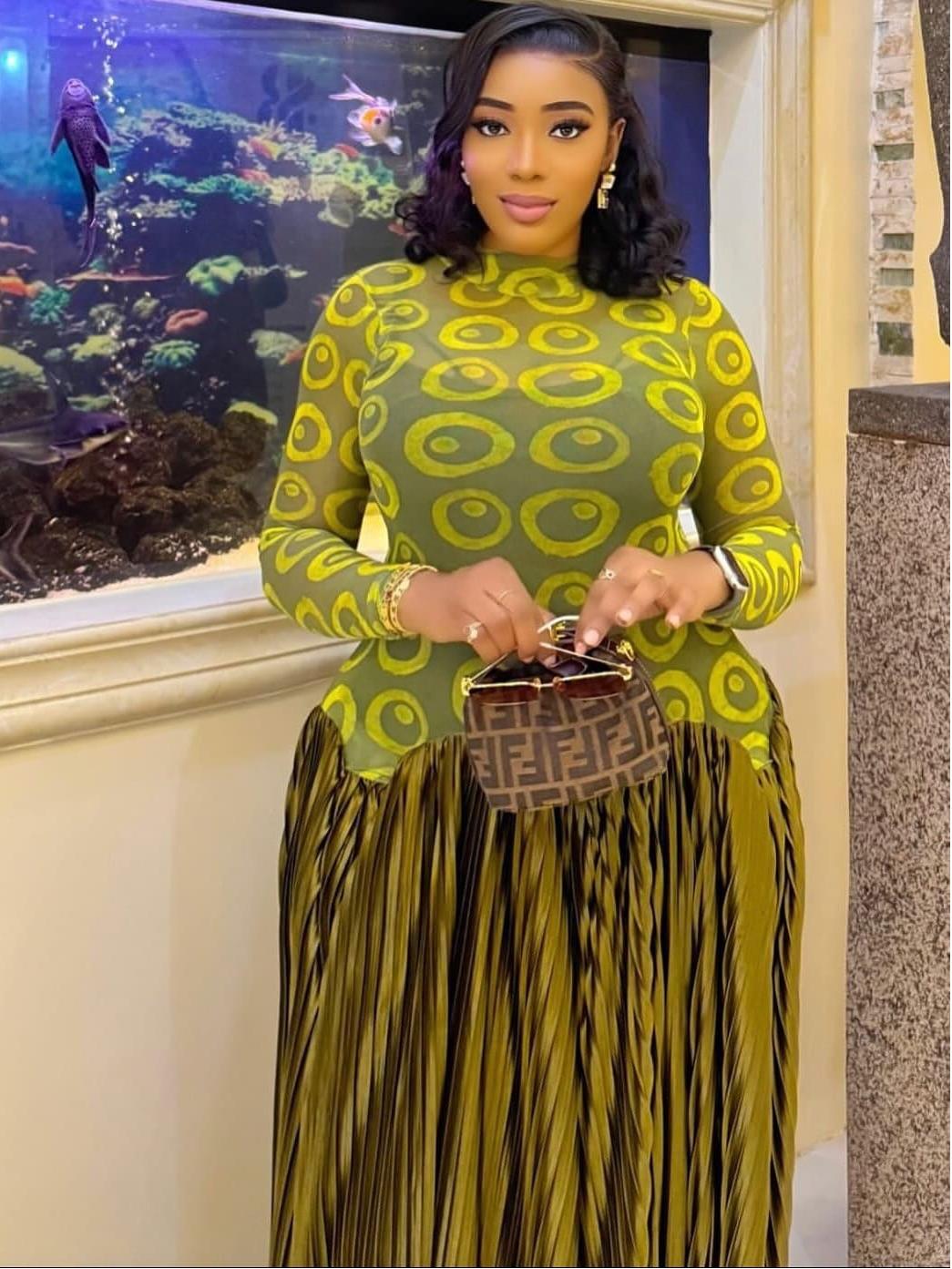 Texture & Color: Deep olive-gold satin with micro-pleats that shimmer; lime-green circular mesh overlay adds graphic pop.
