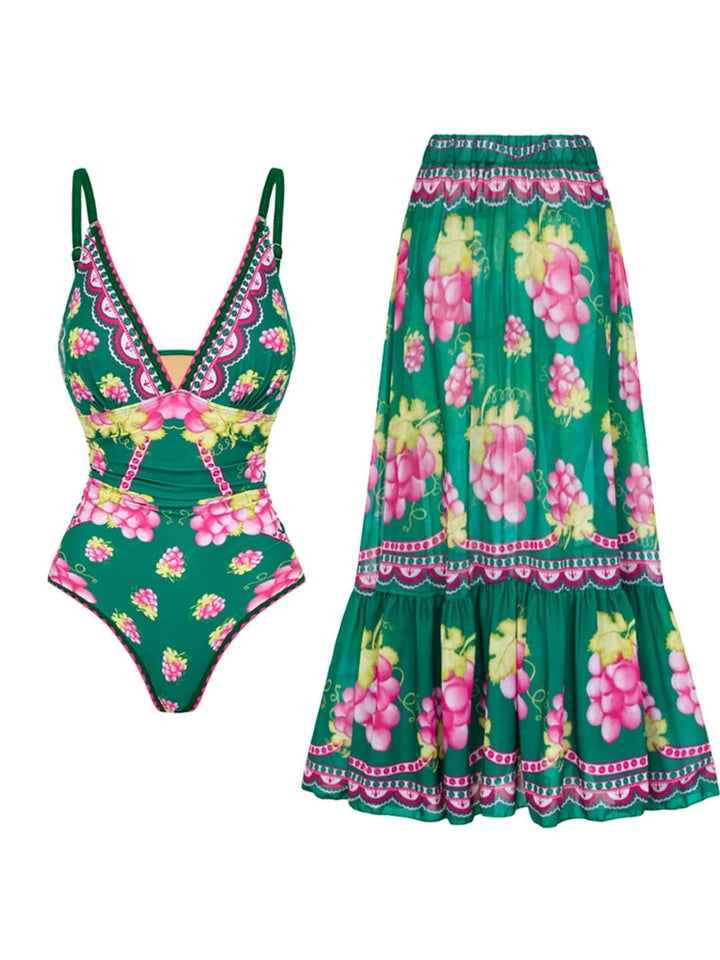 Turn heads on your next getaway with this stunning swimsuit and maxi dress set. Featuring a plunging deep V one-piece and a breezy spaghetti strap cover-up dress, it’s the ultimate blend of sexy and sophisticated resort style.