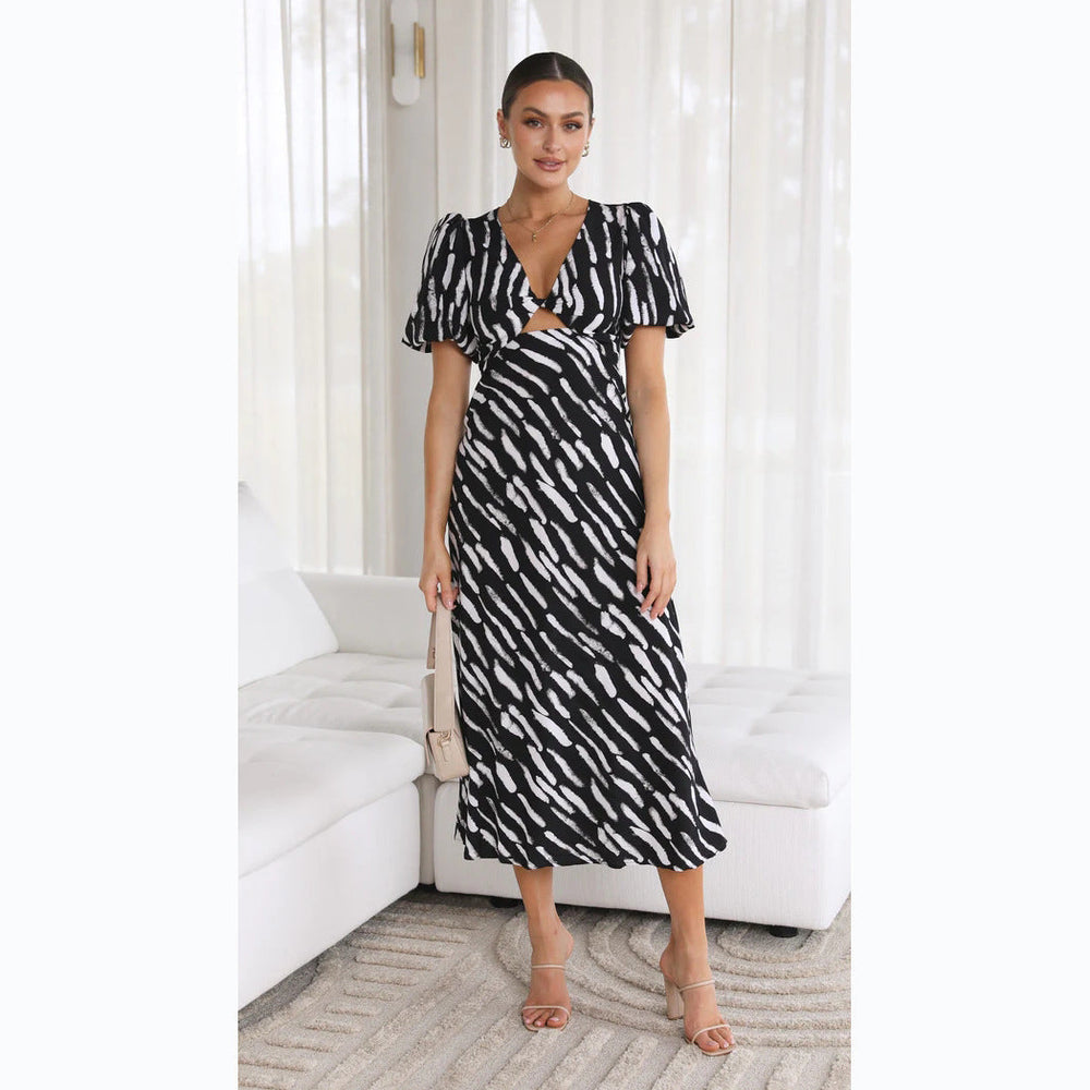 Vestido midi estampado com decote em V e linha A para um estilo fresco