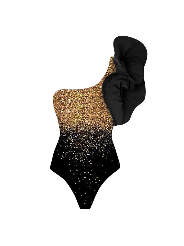 This dual-style swimsuit collection includes two dazzling one-piece designs, each crafted to make a glamorous beach statement. The first features a one-shoulder silhouette with built-in boning for structured support, ruffled detailing, and shimmering sequin print that catches the light beautifully. The second offers a strapless and spaghetti strap convertible option with 3D floral appliqué and matching sequin patterns, blending elegance with playful charm. Both pieces are made from high-stretch fabric that hugs the body comfortably while delivering eye-catching detail, making them perfect for turning heads on sunny escapes.