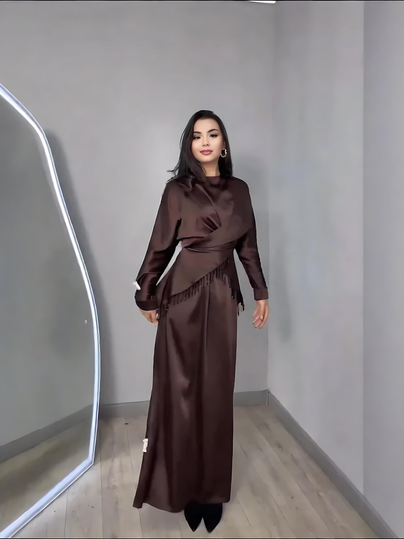 A luxurious chocolate-brown satin set featuring a sleek sleeveless dress paired with a matching tie-front overlay. The overlay is finished with shimmering beaded fringe along the hem, adding movement and a touch of refined glamour. Elegant, coordinated, and perfect for evening occasions or stylish special events.