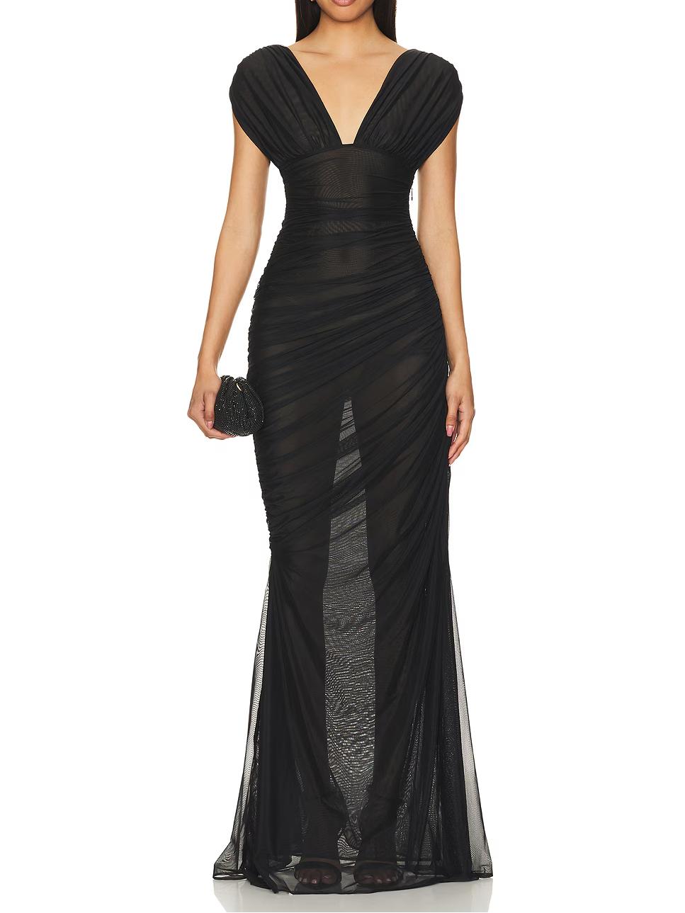 Sheer Mesh Ruched Side Slit Maxi Dress