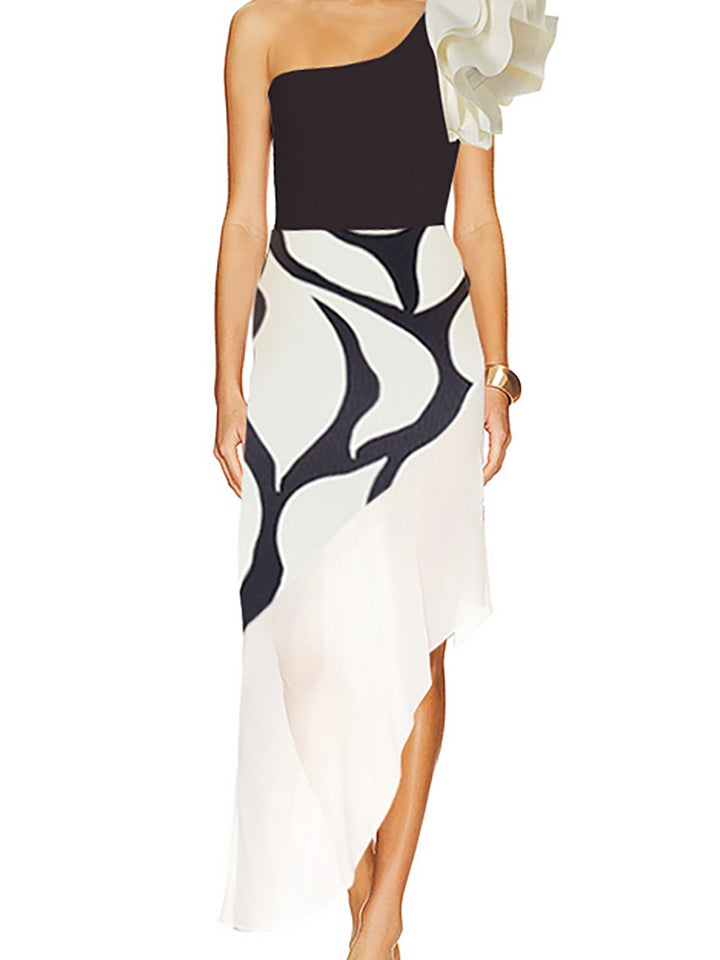 Multi-layer ruffles enhance femininity and add graceful movement one-shoulder neckline offers a unique and elegant look vintage-inspired silhouette with a flattering shape soft stretch fabric ensures a snug yet comfortable fit.