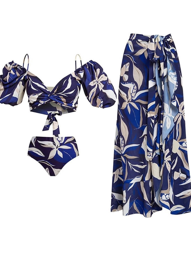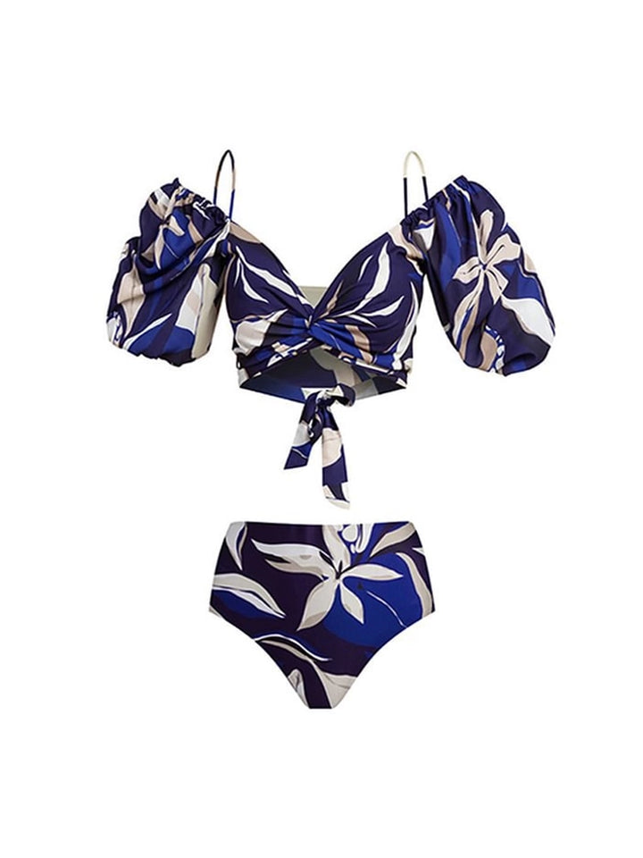 This chic bikini set combines an off-shoulder short sleeve design with a bold floral print, creating a trendy, feminine look. The tie-back feature adds an extra touch of elegance, making it perfect for beach days or poolside lounging.